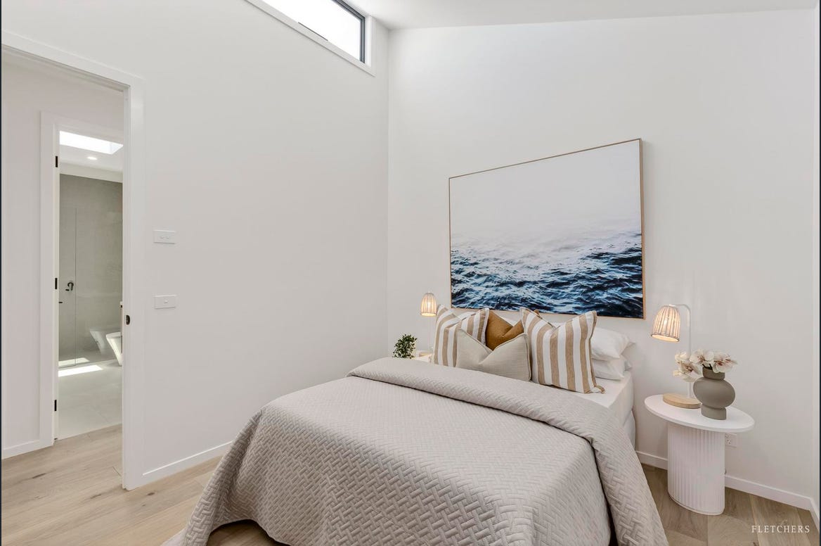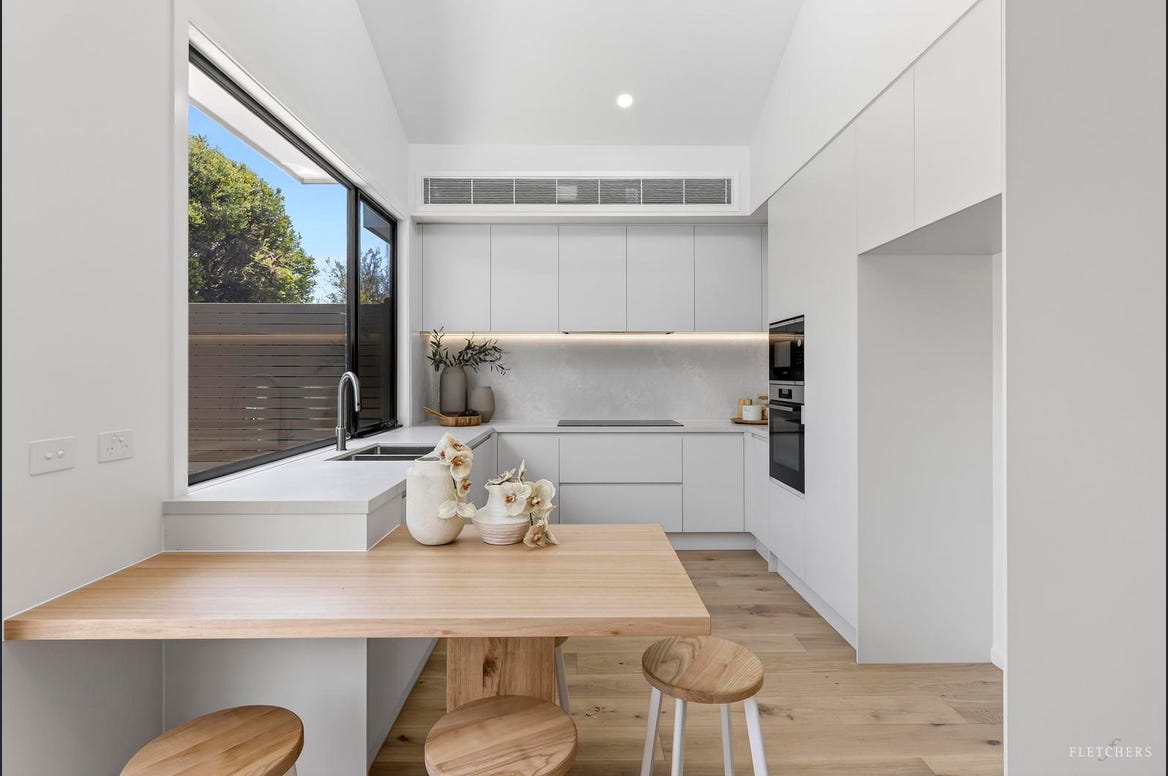 Designer kitchens complement the crisp coastal palette with luxe stone benchtops, premium Bosch appliances and minimalist joinery, while accommodation is equally refined. An elegant main bedroom with ensuite, second robed bedroom and chic, fully tiled bathroom provide stylish comfort for both permanent living and weekend escapes.