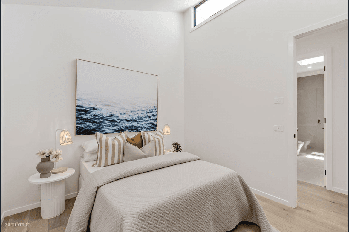 Designer kitchens complement the crisp coastal palette with luxe stone benchtops, premium Bosch appliances and minimalist joinery, while accommodation is equally refined. An elegant main bedroom with ensuite, second robed bedroom and chic, fully tiled bathroom provide stylish comfort for both permanent living and weekend escapes.